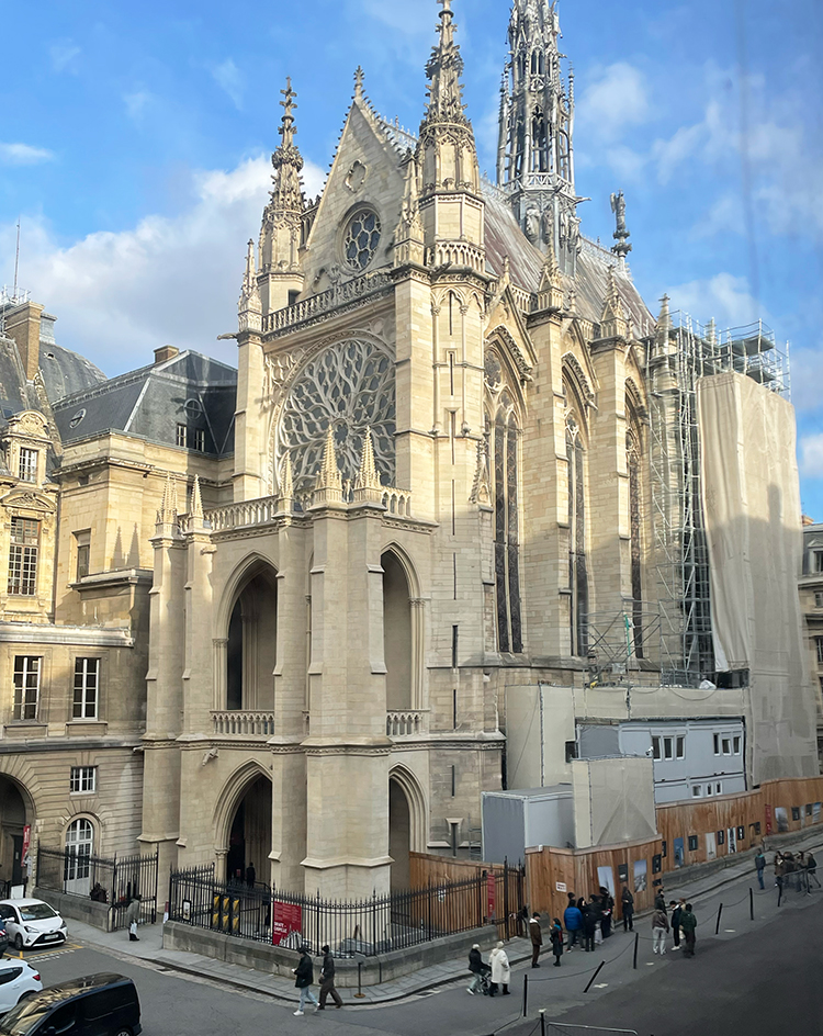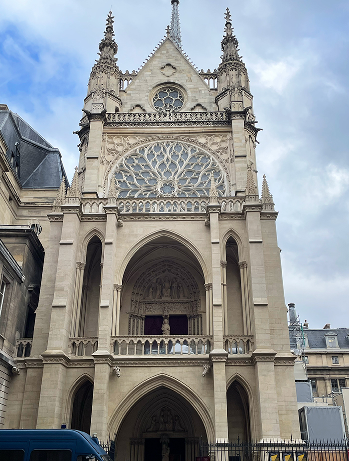 Louis IX (Saint-Louis) souhaite édifier un sanctuaire pour y conserver les reliques de la Passion du Christ acquises auprès de l’empereur latin de Constantinople : la couronne d’épines, un morceau de la vraie croix et d’autres reliques. Une chapelle royale est bâtie entre 1241 et 1248 à l’intérieur du Palais de la Cité, la résidence des rois de France. Sa paternité est le plus souvent attribuée à Thomas de Cormont ou à Robert de Luzarches. Considéré comme un chef d’œuvre de l’ art gothique, l’édifice est très original par sa conception : il n’utilise pas d’arcs-boutants mais s’appuie sur de puissants contreforts renforcés par une importante armature métallique.