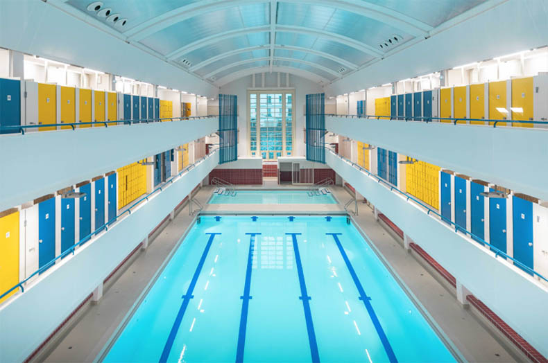 Toute première piscine ouverte à Paris, la piscine Château-Landon affiche aujourd’hui un style « paquebot » avec ses coursives desservant les cabines de bain. ...