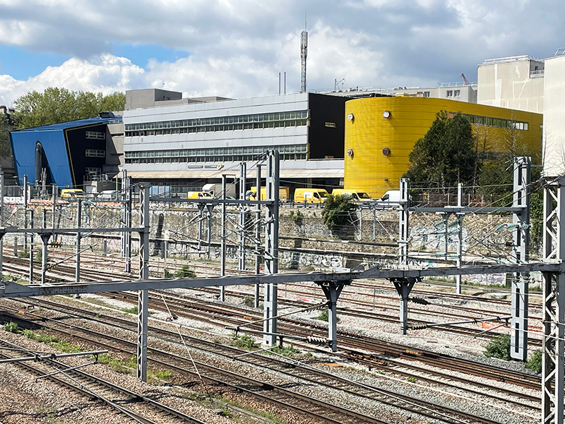 L’agence Architecture-Studio livre en 1994 ce bâtiment destiné à abriter plusieurs fonctions des services de la Poste. Le contexte urbain est dominé par le métro aérien sur le boulevard, et par les voies ferrées en creux menant à la gare du Nord. La fragmentation des 3 volumes et le traitement architectural différencié répondent à la complexité du programme. Sur le boulevard, un premier bâtiment s’aligne sur les immeubles voisins : il abrite le bureau de poste et les bureaux administratifs. Par ses inclinaisons, le volume évoque une boite noire… déboitée, en mouvement, éventrée par le fût de son escalier sur sa face bleue.