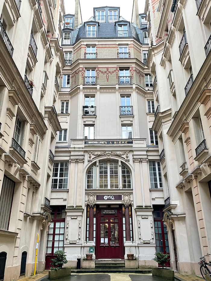 Sous le porche, les murs sont décorés de panneaux de céramiques aux motifs floraux. Passé celui-ci (ouvert en semaine), on découvre une étonnante cour en U aux façades de béton conservant curieusement des éléments décoratifs (pilastres, corniches, frises). Un portail en pierre surmontées de ferronneries marque l’accès à l’entreprise commerciale située en fond de cour. A partir du quatrième étage, les façades sont appareillées en brique, avec des motifs décoratifs en brique rouge sur fond de brique ocre. Un immeuble hybride, à la fois à vocation industrielle, mais conservant un langage décoratif et une fonction d’habitations.