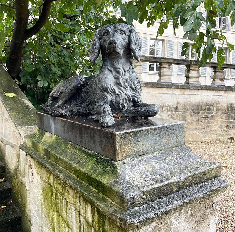 L’Institut National de Jeunes Sourds de Paris : une sculpture de chien trônant sur le départ de l’escalier du jardin