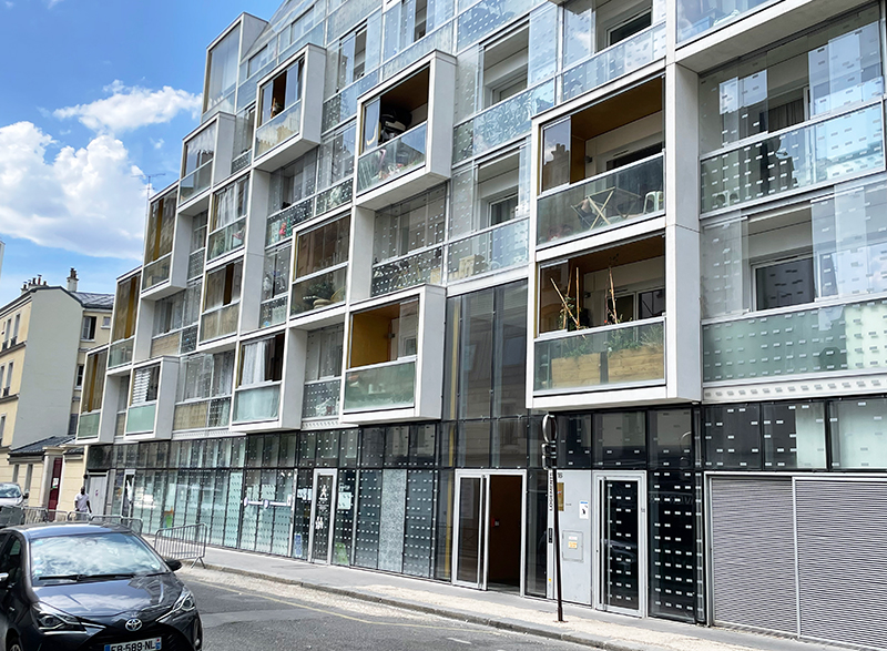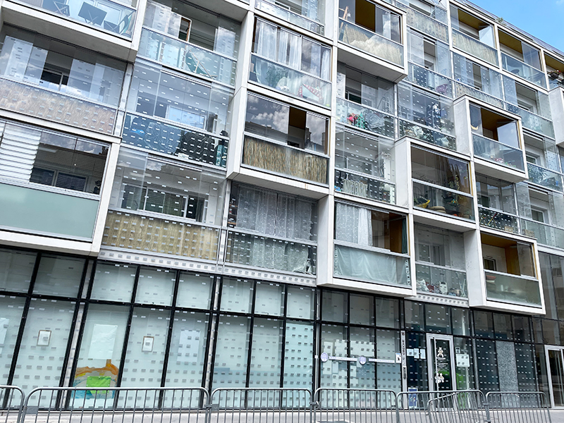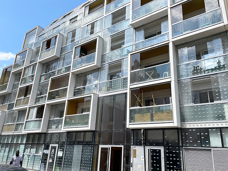 Livrée en 2012, la résidence Plein Soleil mérite son joli nom qui fait référence titre au film éponyme de René Clément. En effet, l’édifice se développe sur un linéaire de 36m exposé Sud. Le programme est mixte et comprend 28 logements et une crèche de 25 berceaux. Les architectes de l’agence rh+ architecture (Adrien Robain & Alix Héaume) ont choisi d’exploiter au maximum la façade Sud conçue comme une façade thermique : chaque appartement est précédé d’une loggia fermée, apporteuse de confort thermique aussi bien l’été que l’hiver. Ainsi, cet espace tampon peut aussi bien s’ouvrir ou se fermer au moyen de panneaux vitrés coulissants au gré des températures.