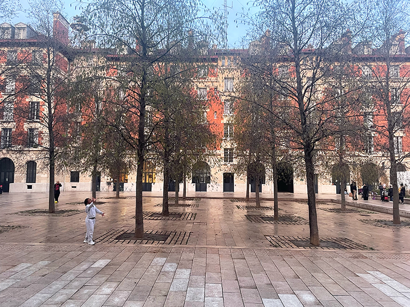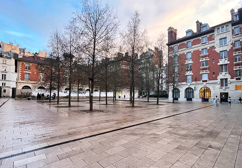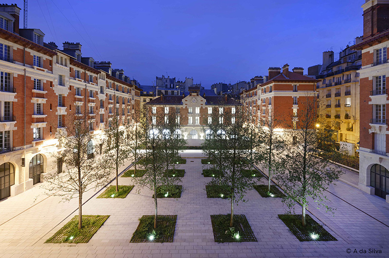 Entièrement réaménagée par l’agence rh+ architecture, l’ancienne caserne abrite depuis 2020 un ensemble de 70 logements sociaux, une crèche, des locaux commerciaux, un café associatif et huit locaux artisanaux. Au centre de la cour transformée en jardin public, l’agence de paysagisme et d’urbanisme OLM a imaginé une trame de 16 arbres plantés afin de révéler la géométrie carrée de celle-ci. Des micro-jardins ont également été plantés, dont l’un a été aménagé en boulodrome.
