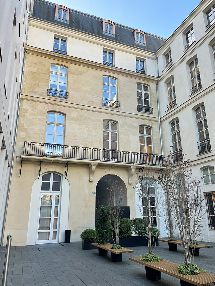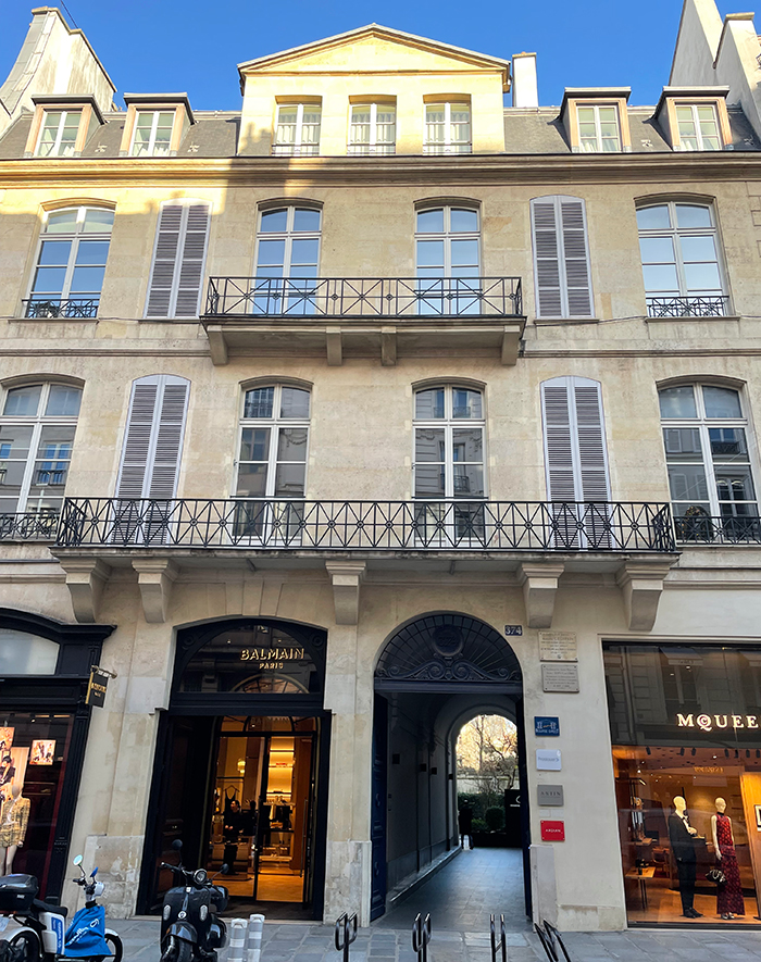 Situé au n°374 rue Saint-Honoré, l’hôtel particulier de Mme Geoffrin est une sobre demeure d’époque Louis XV en pierre de taille. Au-dessus d’un rez-de-chaussée et d’un entresol s’élève l’étage noble où se situent les salons de réception. Ils sont éclairés par de hautes fenêtres rectangulaires cintrées. Un grand balcon reposant sur des consoles (ajoutés ou refaits au début du XIXe siècle) anime le centre de la façade. L’hôtel a été surélevé ultérieurement.