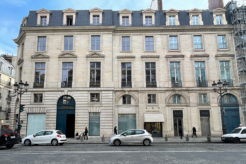 En 1938, l’Oréal installe son siège au n°14 rue Royale, adresse prestigieuse située à deux pas de la rue du faubourg Saint-Honoré. Dessinée par Ange-Jacques Gabriel, la rue Royale est aussi l’une des plus belles artères créées à Paris au XVIIIe siècle : les façades de ses hôtels particuliers ont toutes la même ordonnance et incarnent le classicisme français par leur modénature très sobre.