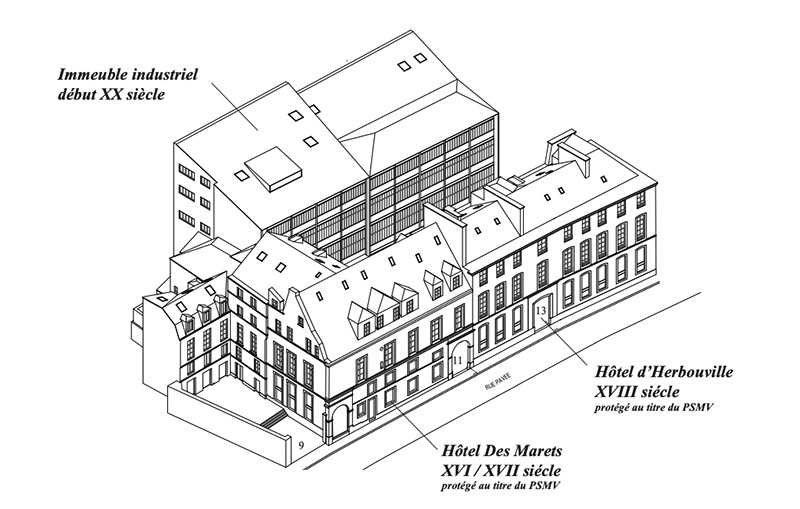 Sur l’emplacement de l’hôtel de Lorraine est reconstruit un nouvel hôtel particulier au milieu du XVIe siècle. Ils sont acquis en 1681 par la veuve du comte Dauvet des Marets : son mari possédait la charge très prestigieuse de grand fauconnnier de France (devenue purement honorifique sous Louis XIV). En 1685, la demeure est divisée en deux suite à la succession familiale : l’hôtel des Marets aux n°9-11, l’hôtel d’Herbouville au n°13.