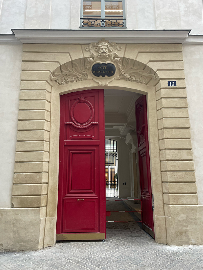 En 1737, Jean Hardouin-Mansart de Jouy (1705-1783), membre de la célèbre dynastie d’architectes, procède à la reconstruction de la façade sur rue de l’hôtel d’Herbouville, alors habité par la famille Amelot. Très sobre, celle-ci est percée de fenêtres cintrées et légèrement moulurées. Son portail est plus intéressant : appareillé à refends, il est sommet d’un cartouche entouré de palmes et de guirlandes, surmonté d’un mascaron d’homme barbu. Dans le cartouche est gravé le nom de l’hôtel.