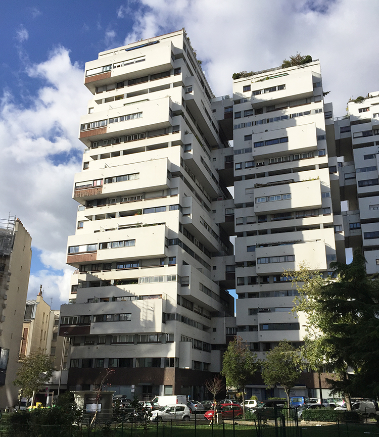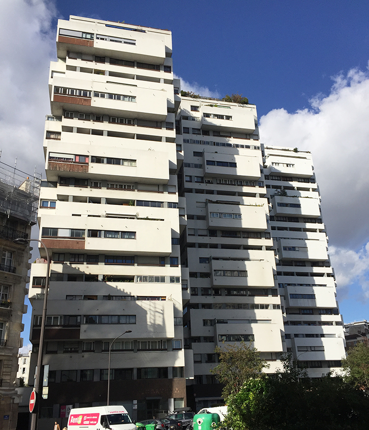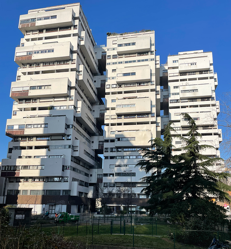Cette géométrie des volumes ainsi que les forts contrastes de lumière entre les pleins et les vides confèrent à cet ensemble une grande plasticité. Les tours sont reliées entre elles par des ponts laissant voir le ciel. A l’intérieur des logements, le programme prévoit une partition entre pièces de jour et pièces de nuit. L’immeuble a reçu le label « Patrimoine du XXe siècle ».