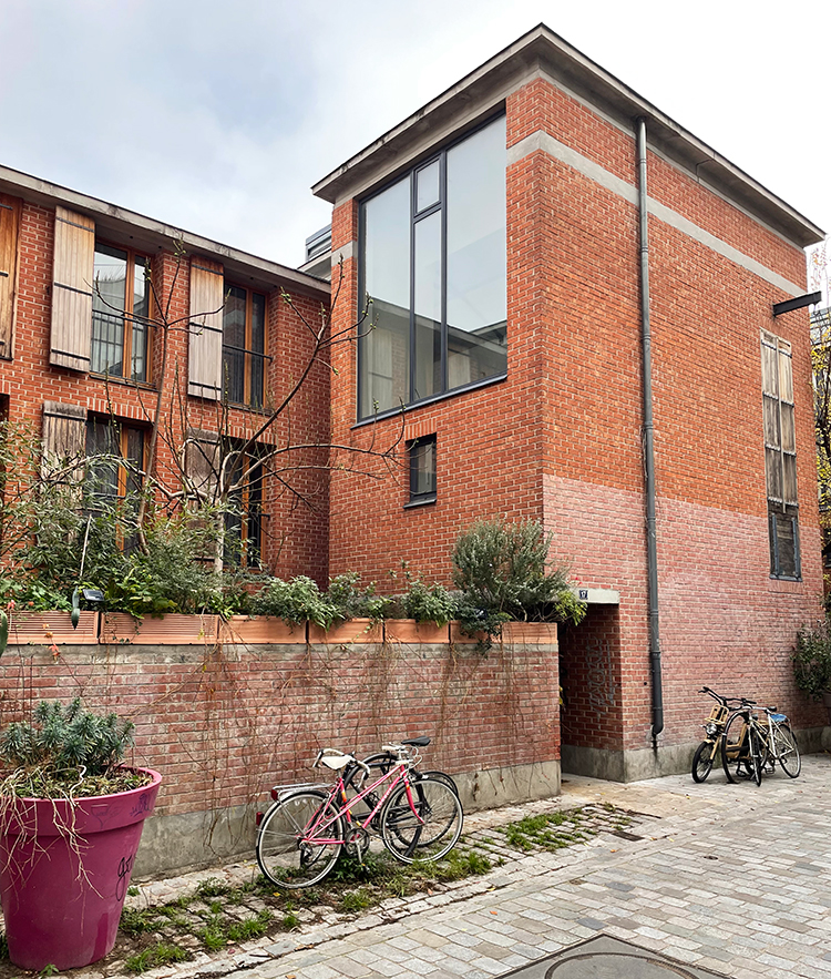 L’opération comprend la réhabilitation de trois bâtiments anciens donnant sur la rue des Panoyaux, et d’un quatrième en fond de cour (agrandi aux angles par de petites extensions en brique). Donnant sur la cité du Labyrinthe et sur le cœur de l’îlot, des villas-ateliers et logements viennent enrichir le nouveau programme : dans une écriture contemporaine, ces nouveaux bâtiments en R+2 incarnent la continuité sans retour au passé. Construits en brique, ils dialoguent avec l’ancienne fabrique au n°29 et les logements Art déco aux n°33-35 de la même rue. L’opération a été achevée en 2003 par l’architecte Olivier Bressac après le décès de Bernard Huet.