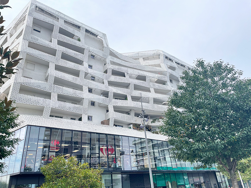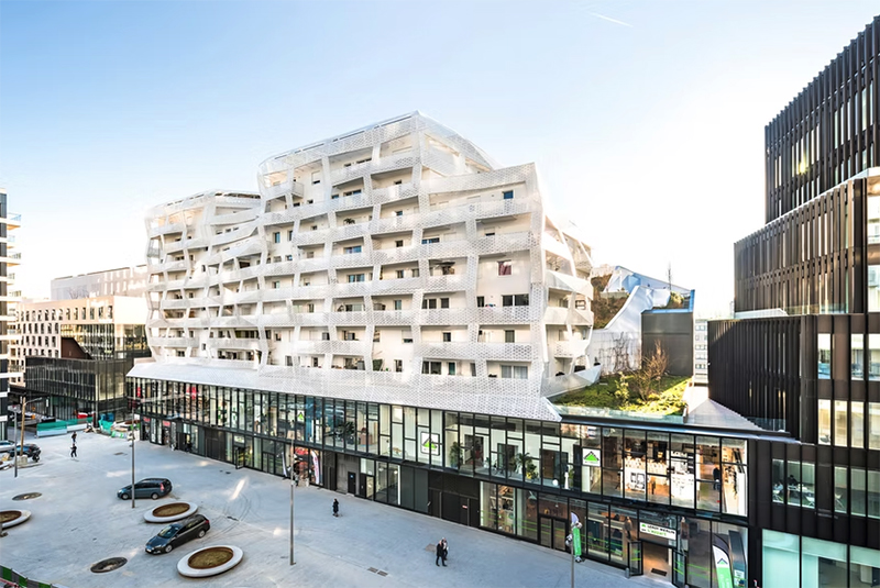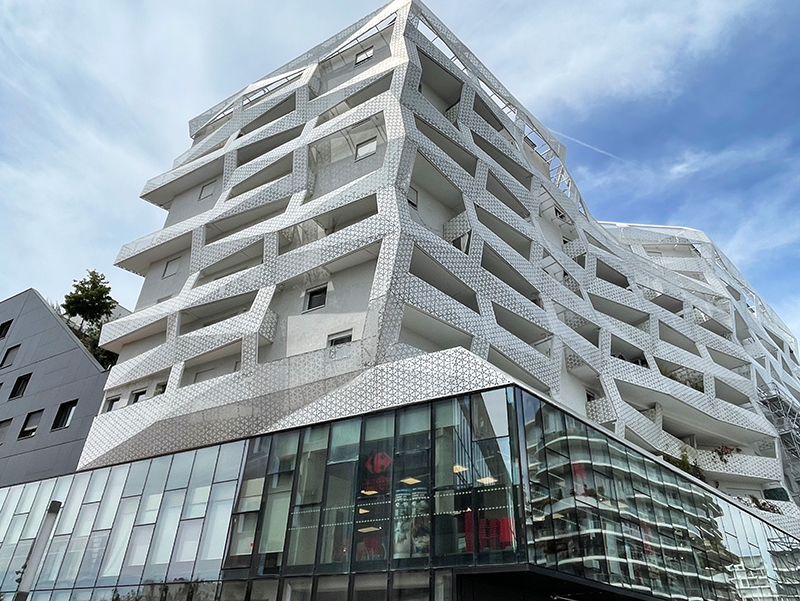 Livrés en 2018, ces 78 logements familiaux sociaux ont été réalisés par l’agence Saison Menu & Associés. Ils s’élèvent au-dessus d’un socle occupé par des enseignes commerciales. L’immeuble se singularise par sa double peau en tôle blanche perforée qui se plie à la manière d’un origami. Cette peau externe préserve ainsi l’intimité des résidents.