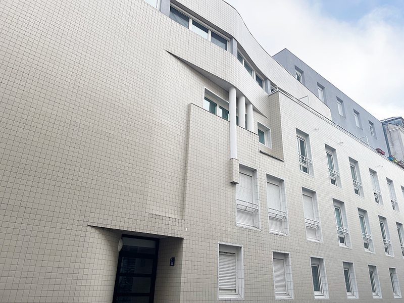 Sur la rue de Ménilmontant, la façade se raccroche à l’alignement des immeubles voisins et pourtant elle s’anime délicatement avec de légères courbes, des retraits et des plans qui se coupent. Le revêtement de petits carreaux de grès unifie l’ensemble. Les architectes traitent également avec beaucoup de sensibilité les creux : la cour de l’immeuble est traitée comme une clairière accidentée, à l’image des nombreuses venelles anciennes du quartier. Les façades y offrent de délicats et multiples jeux de courbes. A l’intérieur des volumes, les logements sont presque tous différents et uniques à la fois.