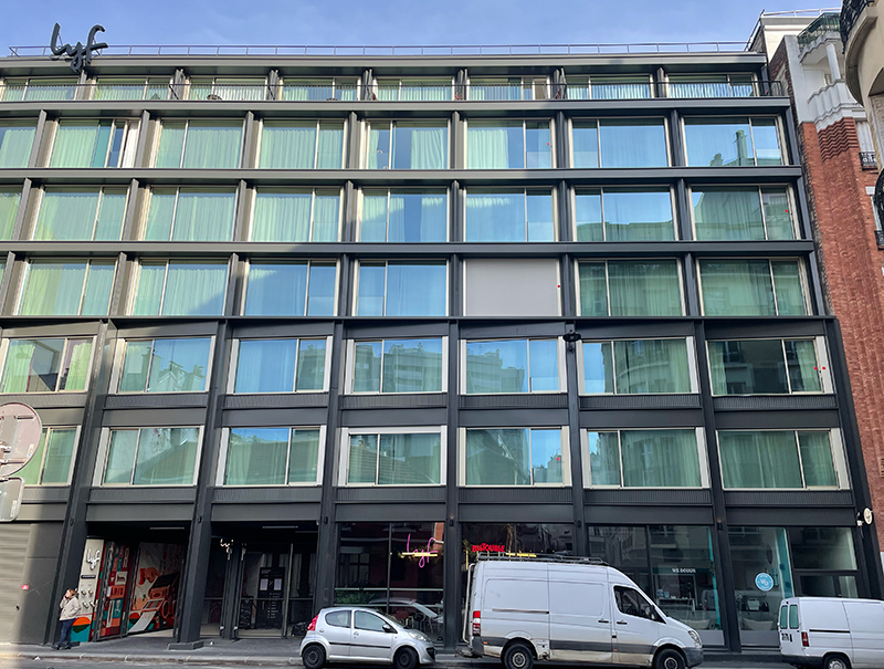 Sur la rue, une nouvelle façade à l’esprit industriel conçue en ossature bois et recouverte de bardage d’aluminium voit le jour. Le dernier étage est placé en retrait et précédé de belles terrasses. Au-rez-de-chaussée, un passage mène au jardin semi-enterré où l’on trouve un coworking et un café ouvert au public. En outre, l’hôtel dispose d’une cuisine partagée, d’un rooftop végétalisé et d’une salle de gym.