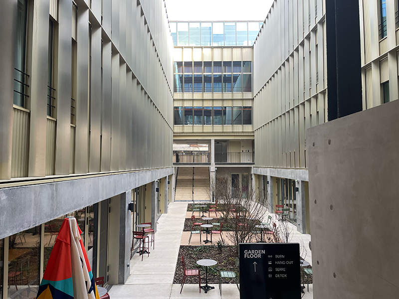 Afin de garantir un faible impact carbone, le parti pris des architectes est de conserver un maximum d’éléments existants comme les planchers et les structures porteuses (une partie en acier, l’autre en béton). Au centre, l’ancienne « halle des machines » devient un rez-de-jardin creusé sous le niveau du sol ; sa verrière est supprimée pour offrir un jardin à ciel ouvert, créant un ilot de fraicheur. Les chambres prennent place autour de ce vide central.
