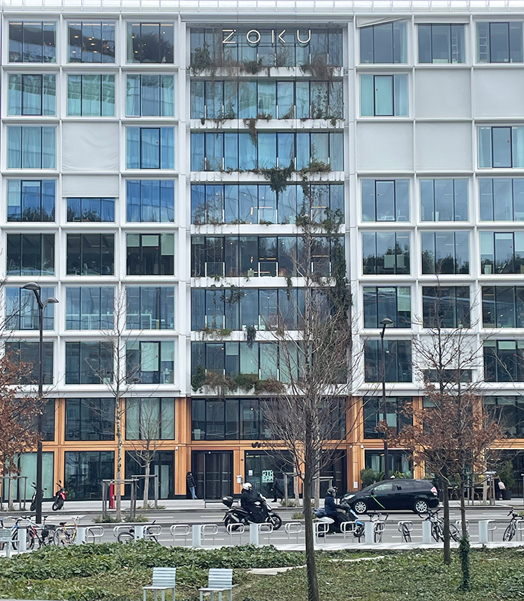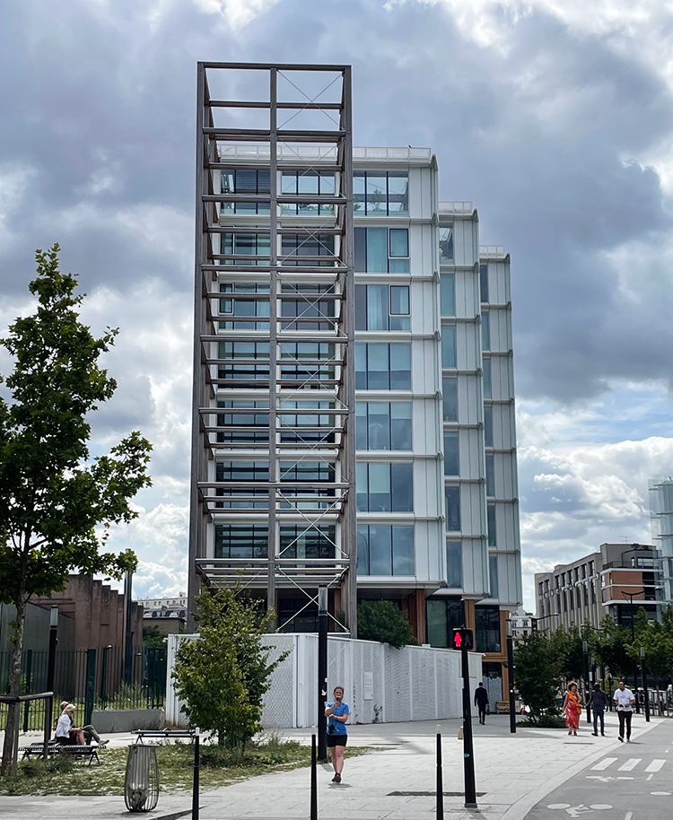 En 2022, l’agence PCA-Stream a livré cet immeuble de 16.000 m2 situé juste en face du Tribunal de Paris. Il est l’une des dernières réalisations faisant partie de la nouvelle ZAC Clichy-Batignolles. Issu de l’appel à projet « Réinventer Paris » de 2014, cet immeuble se distingue par sa structure porteuse mixte béton-bois ayant utilisé 1.820 m3 de bois transformé en France. Cette charpente est d’ailleurs visible en partie basse de la façade sud.